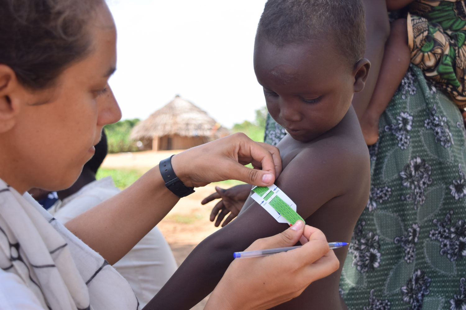 MSF teams weigh babies and children, measure their upper arm circumference, check they have an appetite and also give a measles vaccination or medication for malaria if necessary. Mums receive plumpynut, soap and a mosquito net for their child and are asked to return the following week, until their children are no longer malnourished. Photographer: Charlotte Morris